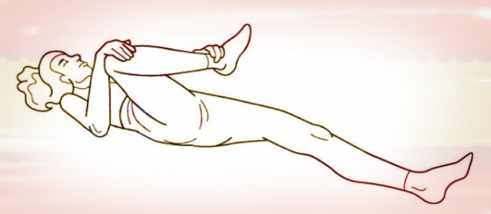 Ляг на ровную поверхность, согни ногу, в которой чувствуешь боль, и осторожно потяни ее к плечу. Когда почувствуешь растяжение, постарайся удержать ногу в таком положении 30 секунд. Разогни ногу, полежи немного, сделай еще 2 подхода.