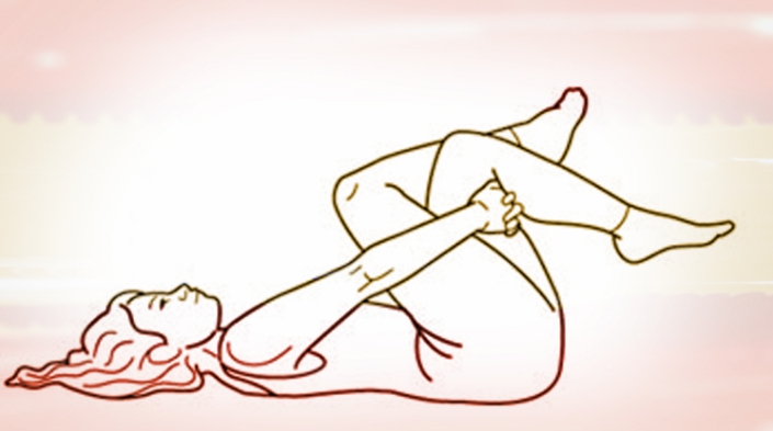 2.Снова в положении лежа согни ноги в коленях и осторожно подтяни их к груди, не отрывая таз от пола.